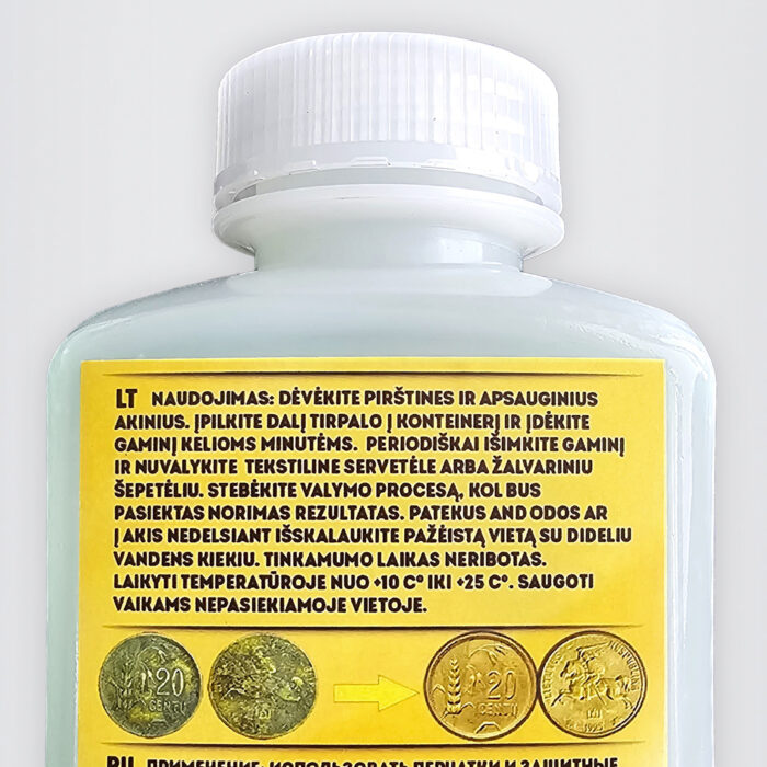 Priemonė puikiai tinka 1926-1957 metų TSRS (Tarybų Sąjungos) gamybos monetų valymui (nominalas 1, 2, 3 ir 5 kapeikos), kurios buvo pagamintos iš aliuminio bronzos. Taip pat idealiai šalina visus oksidus ir nuosėdas nuo Lietuvos tarpukario periodo monetų, iškaltų 1925 metais (nominalas 1, 5, 10, 20 ir 50 centai). Pridedamas žalvarinis poliravimo šepetėlis. Po valymo nupoliruokite monetą su šepetėliu tam, kad moneta įgautų pirminį blizgesį.