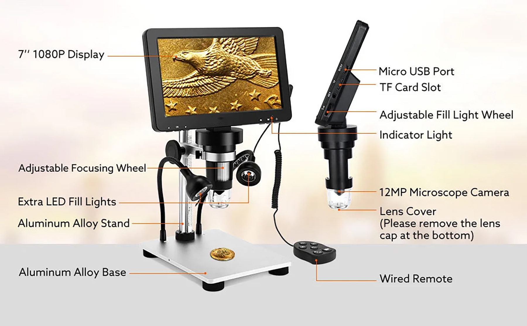 7 colių pasukamas FHD ekranas kartu su 12 megapikselių kamera ir 1080P aukštos raiškos vaizdo rodymu leidžia užfiksuoti ryškias nuotraukas ir vaizdo įrašus. Tokia sistema suteikia galimybę aiškiai stebėti mikropasaulį. Ekranas gali būti pasukamas iki 90°, todėl naudotis mikroskopu patogiau, sumažėja akių ir kaklo įtampa.