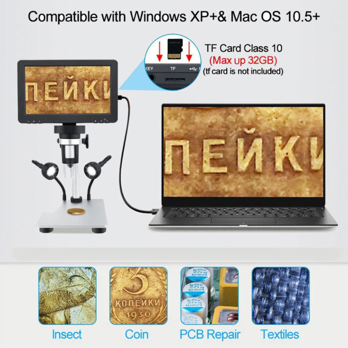 Galima prijungti prie kompiuterio ir stebėti vaizdą didesniame ekrane. Mikroskopas suderinamas su Windows ir Mac operacinėmis sistemomis, todėl patogu analizuoti ir dalintis duomenimis. Papildomos programinės įrangos diegti nereikia – pakanka naudoti „Windows Camera“ programą Windows 10/11 sistemose arba „Photo Booth“ programą iMac ir MacBook kompiuteriuose.
