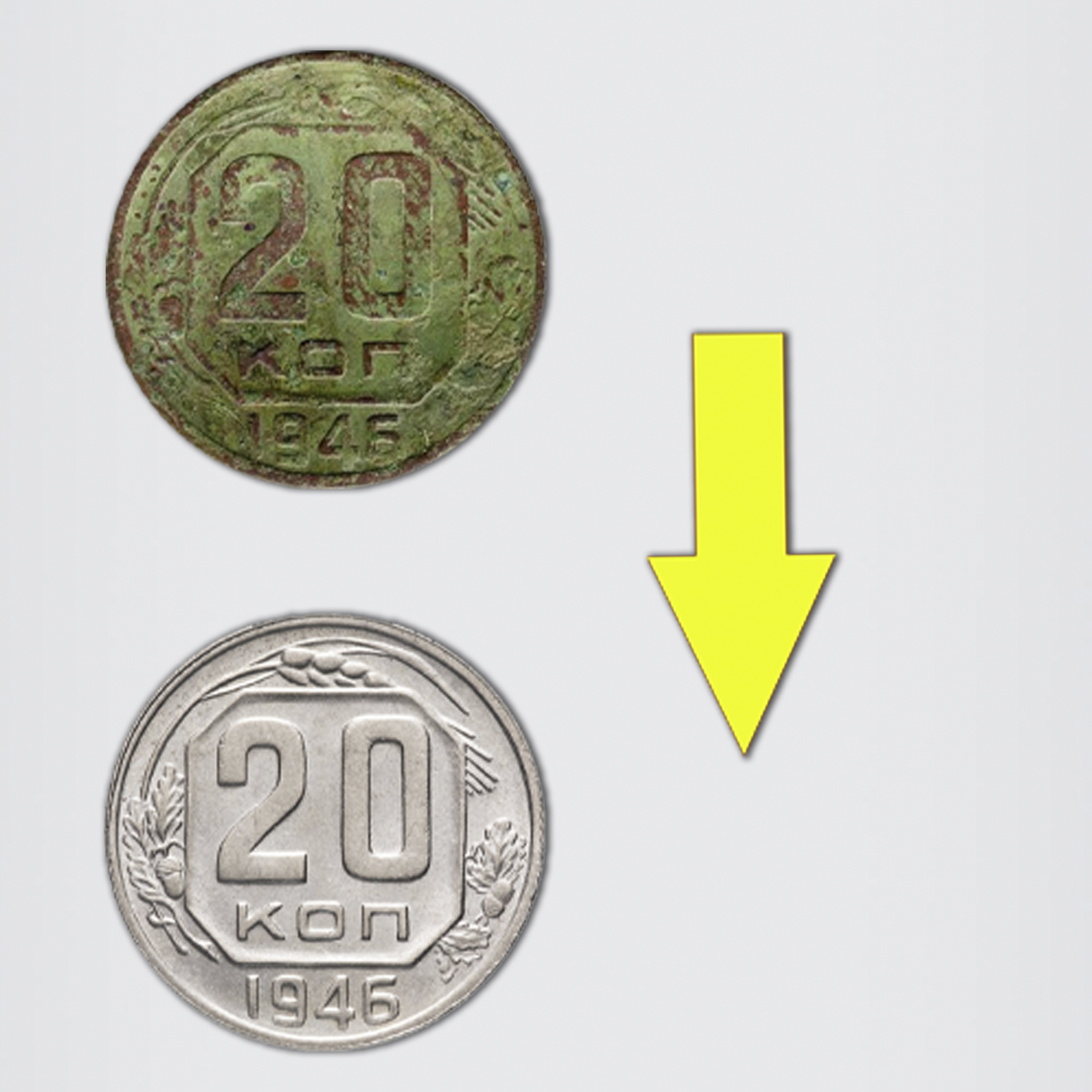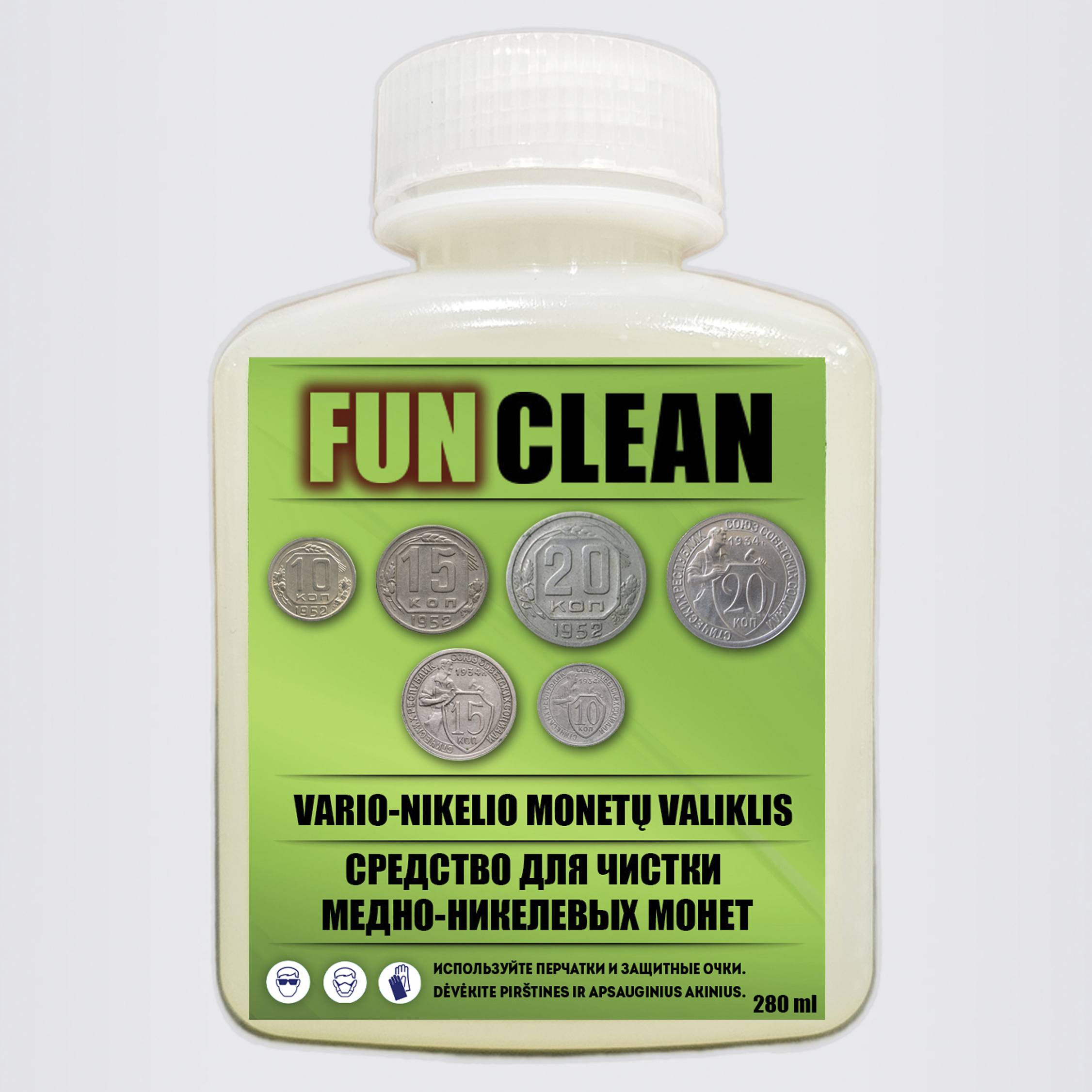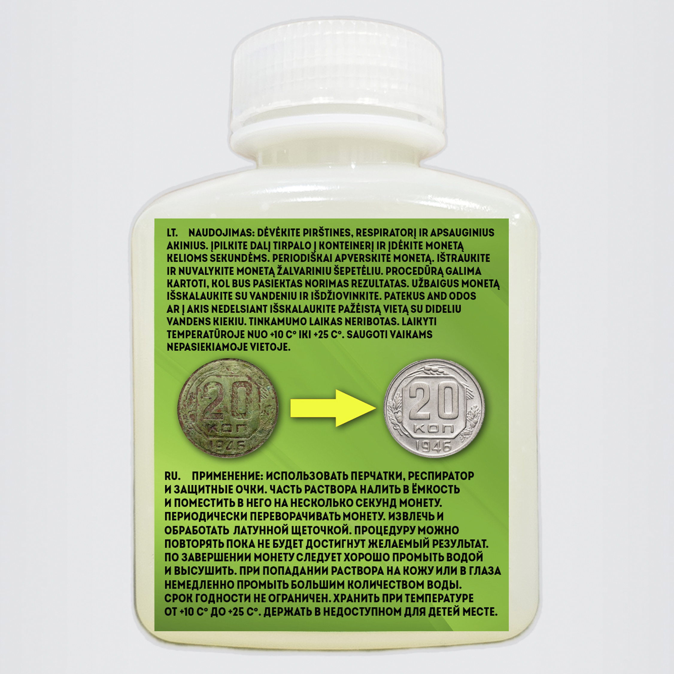 Priemonė puikiai tinka 1924-1958 metų TSRS (Tarybų Sąjungos) gamybos monetų valymui (nominalas 10, 15 ir 20 kapeikos).