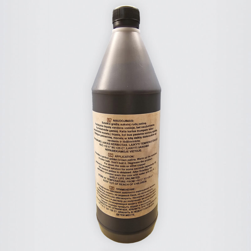 €39.92Original price was: €39.92.€27.98Current price is: €27.98.Į krepšelįPriemonė skirta varinių monetų dirbtiniam patinavimui. Gaunama aukso rudos spalvos patina su vidutiniu blizgesiu. Patinos spalva priklauso nuo laiko, kurio bėgyje gaminys buvo apdorojamas naudojant priemonę. Pridedama: naudojimo instrukcija su nuotraukomis.